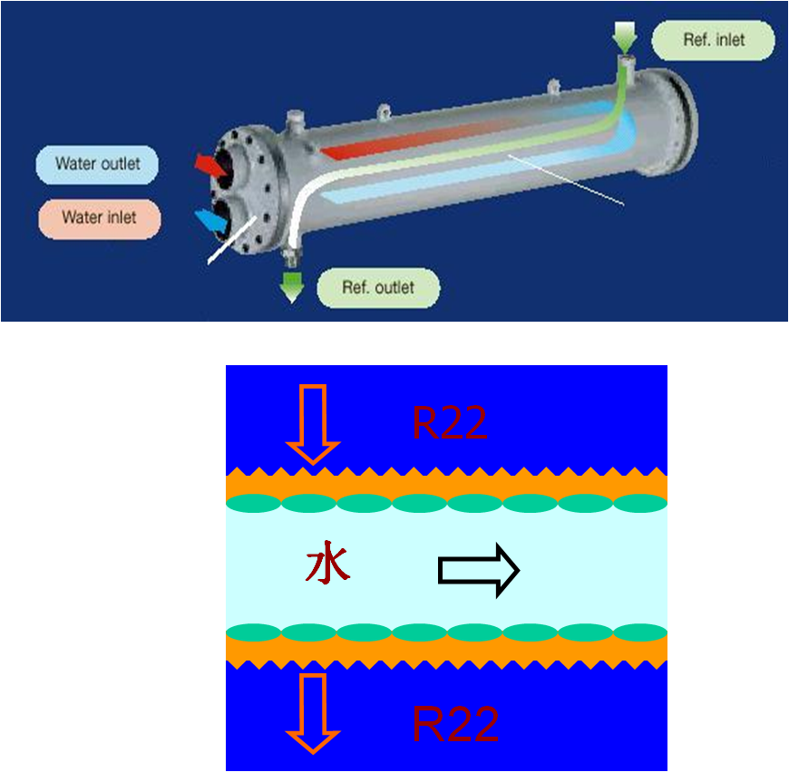 1. 殼管式熱交換器采用高效的雙螺紋銅管,提高了殼側(cè)制冷劑以及管側(cè)冷卻水間的熱交換效果,比普通傳熱銅管換熱效率提高達(dá)30%左右。